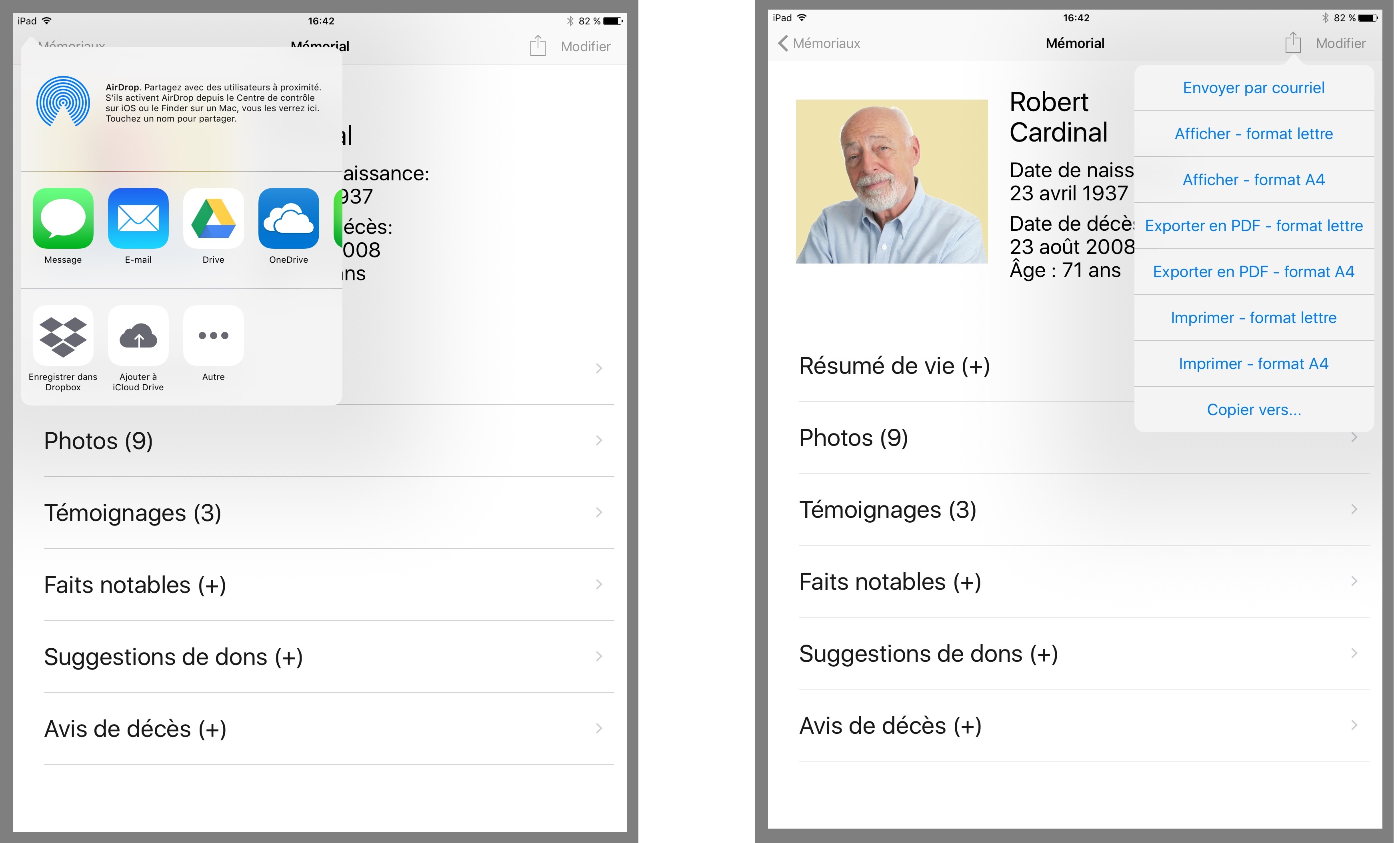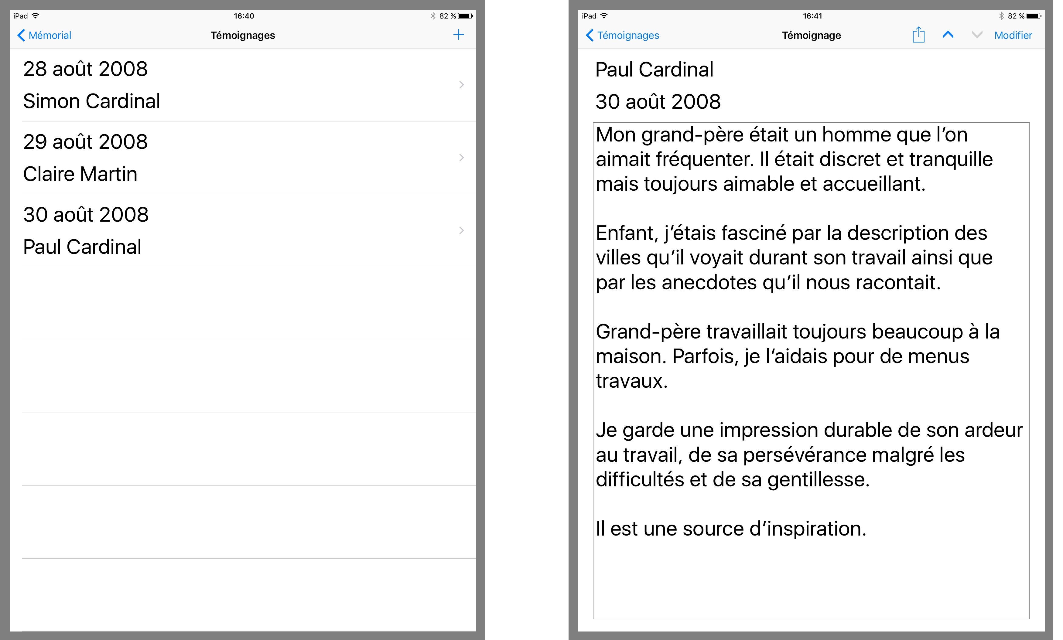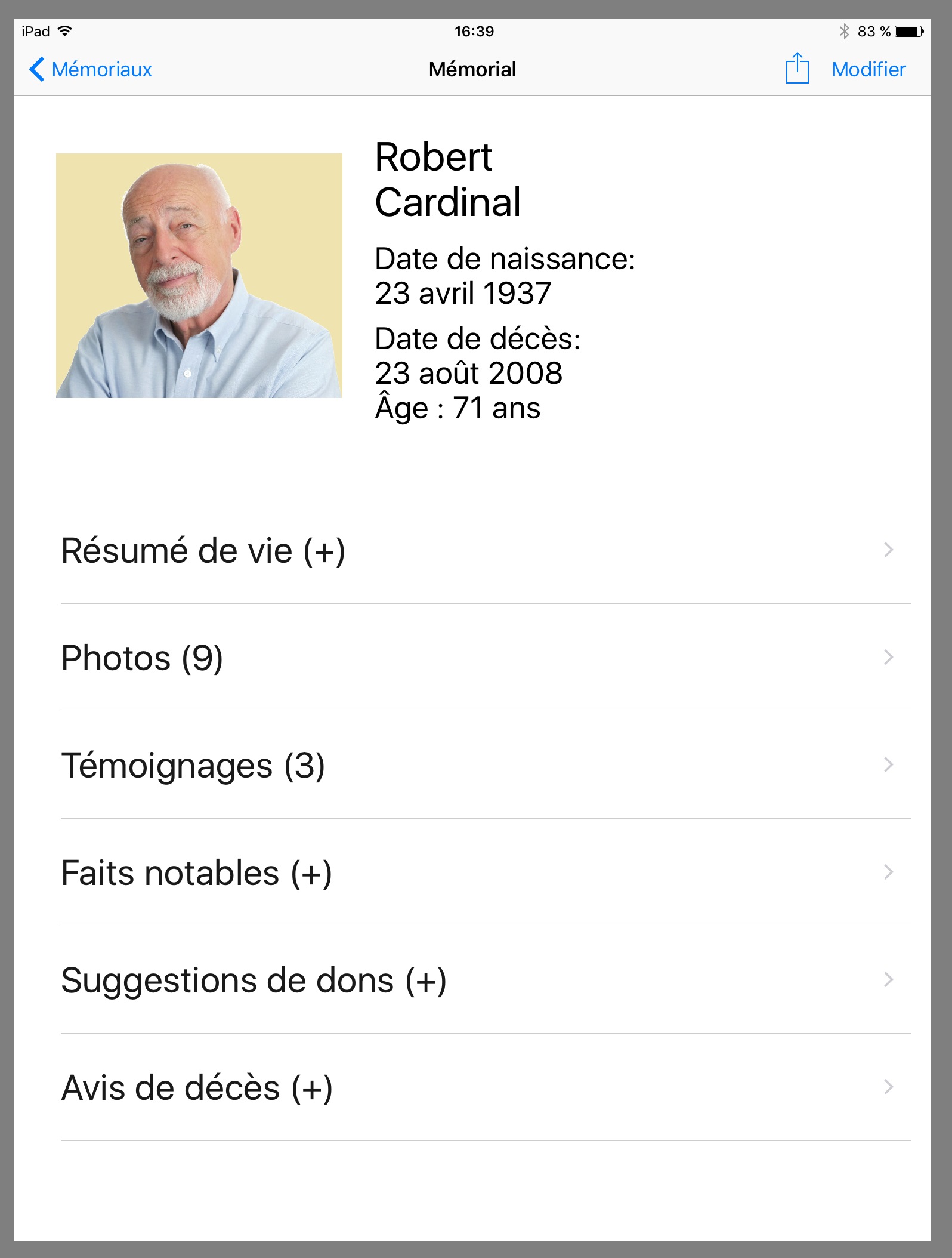 - Tous les mémoriaux sont personnels. Ils sont enregistrés sur votre iPhone ou iPad et non pas sur un serveur quelconque