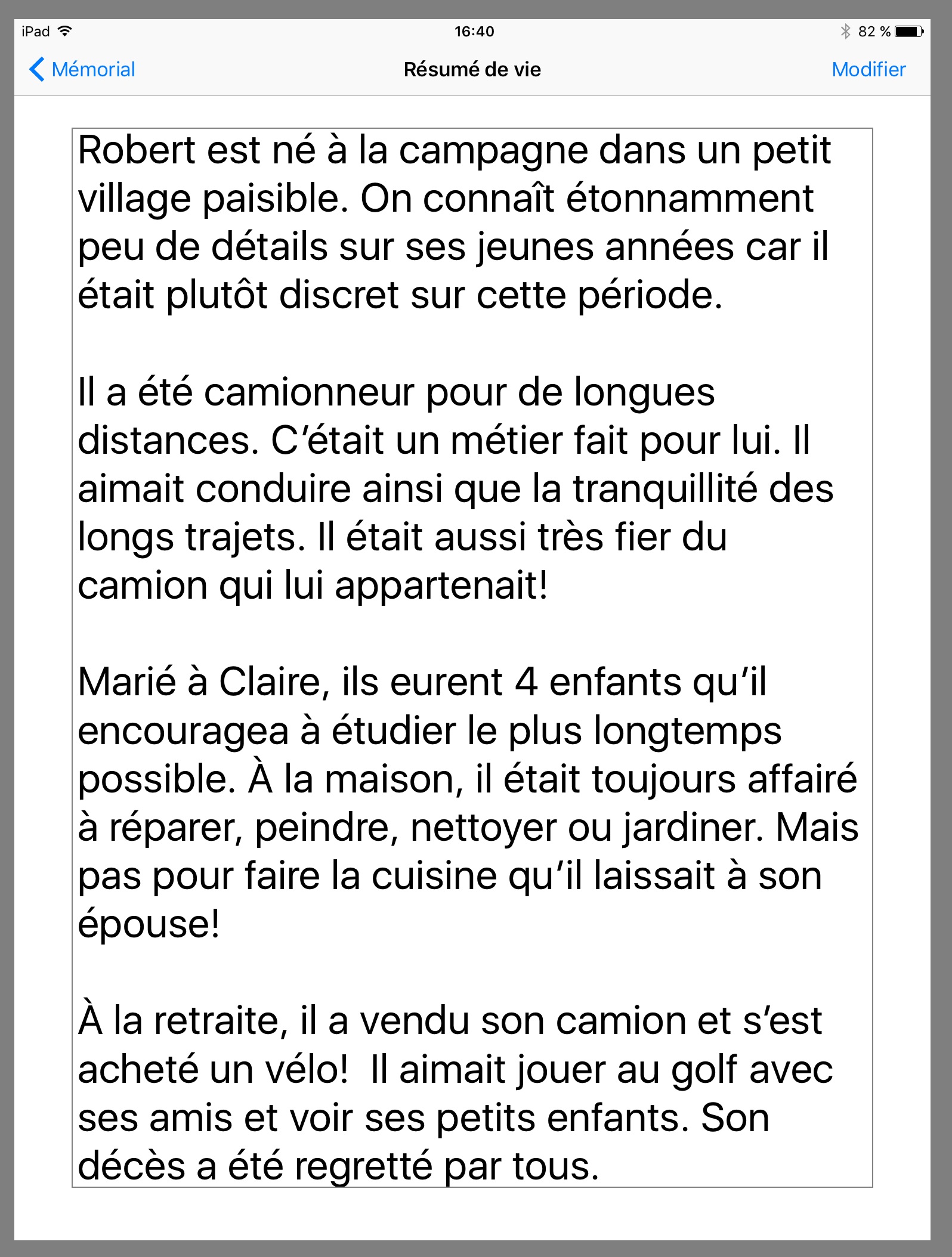 Les mémoriaux sont personnels. Tout d’abord, ils sont stockés sur votre iPhone ou votre iPad et non sur un serveur Internet ce qui vous permet de les consulter en tout temps sans connexion Internet ou cellulaire. De plus, vous pouvez y inscrire ce vous voulez selon vos goûts et vos sentiments.